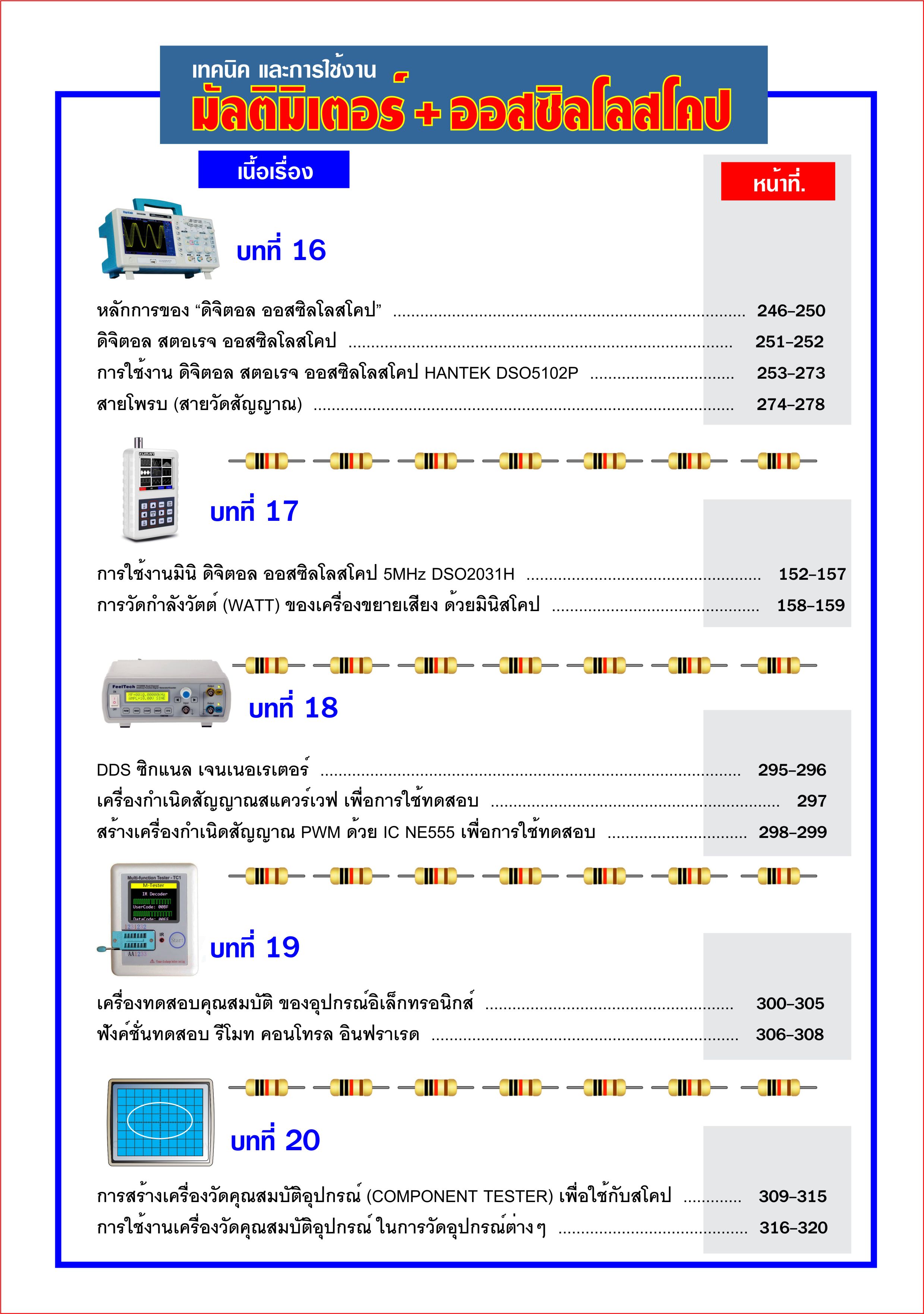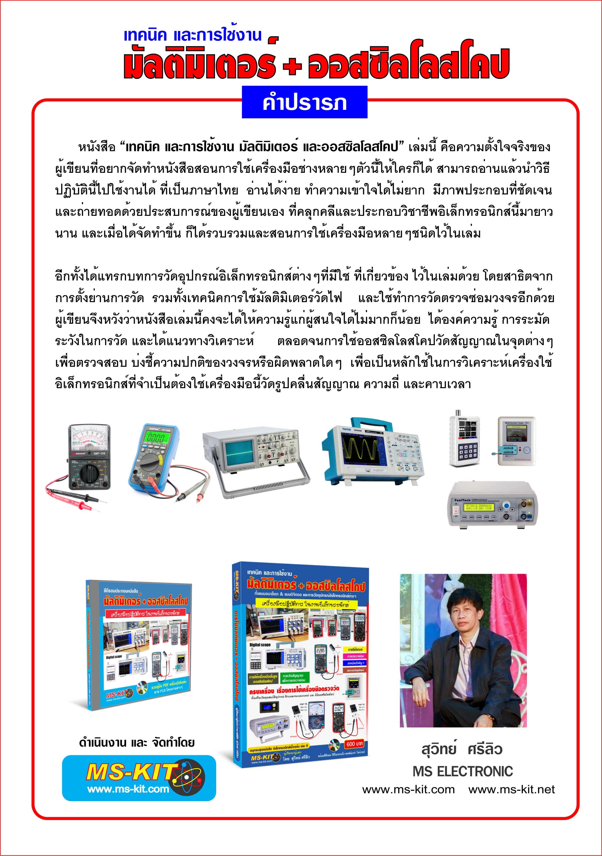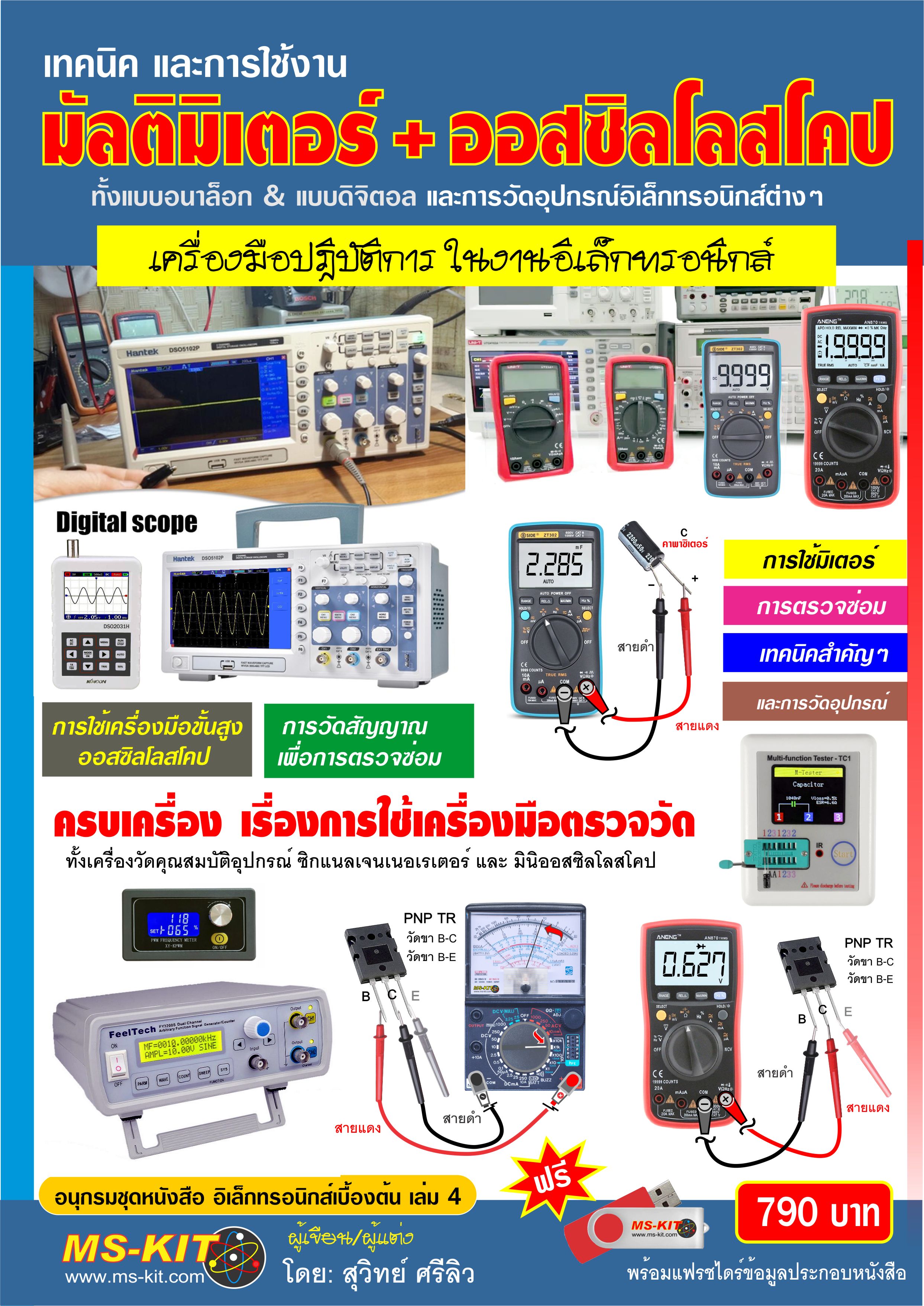 นี่คือหนังสืออิเล็กทรอนิกส์เล่มที่ 4 ในอนุกรม "สู่โลกอิเล็กทรอนิกส์" ที่จะทำให้คุณใช้เครื่องมือมัลติมิเตอร์แบบต่างๆวัดอุปกรณ์อิเล็กทรอนิกส์ต่างๆได้ และใช้ "ออสซิลโลสโคป" วัดรูปคลื่นสัญญาณต่างๆทางอิเล็กทรอนิกส์ได้ ก้าวเข้าสู่ความเป็นมืออาชีพยิ่งขึ้นในการวิเคราะห์และตรวจซ่อมวงจรอิเล็กทรอนิกส์